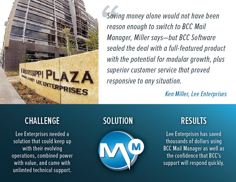 BCC Mail Manager slices through ever-changing USPSВ® red tape to provide dependable mail processing performance—easily adapting to changes in your business, and in the industry itself—while always delivering optimal mailing efficiency and economy.
