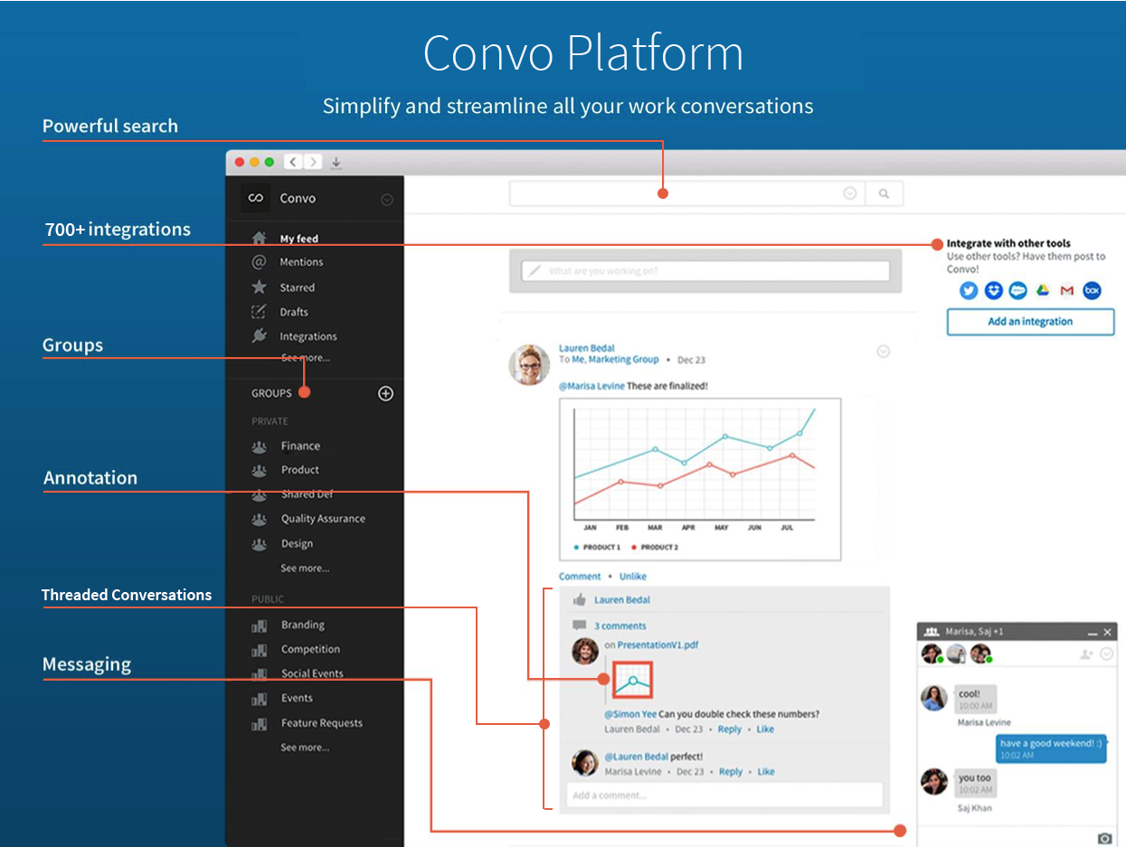 Convo is a business collaboration tool for fast-moving teams to centrally share, organize, and archive information securely. Our real time messaging and smart notifications can help complete projects faster than ever. With Convo, ask your team a question, share a project update, preview files, annotate or leave clear feedback from anywhere. Put your brainpower all in one place.