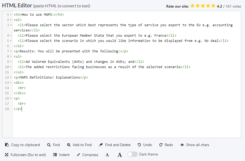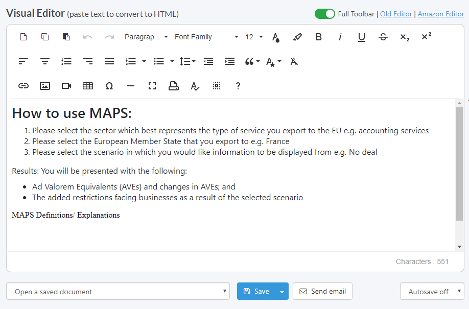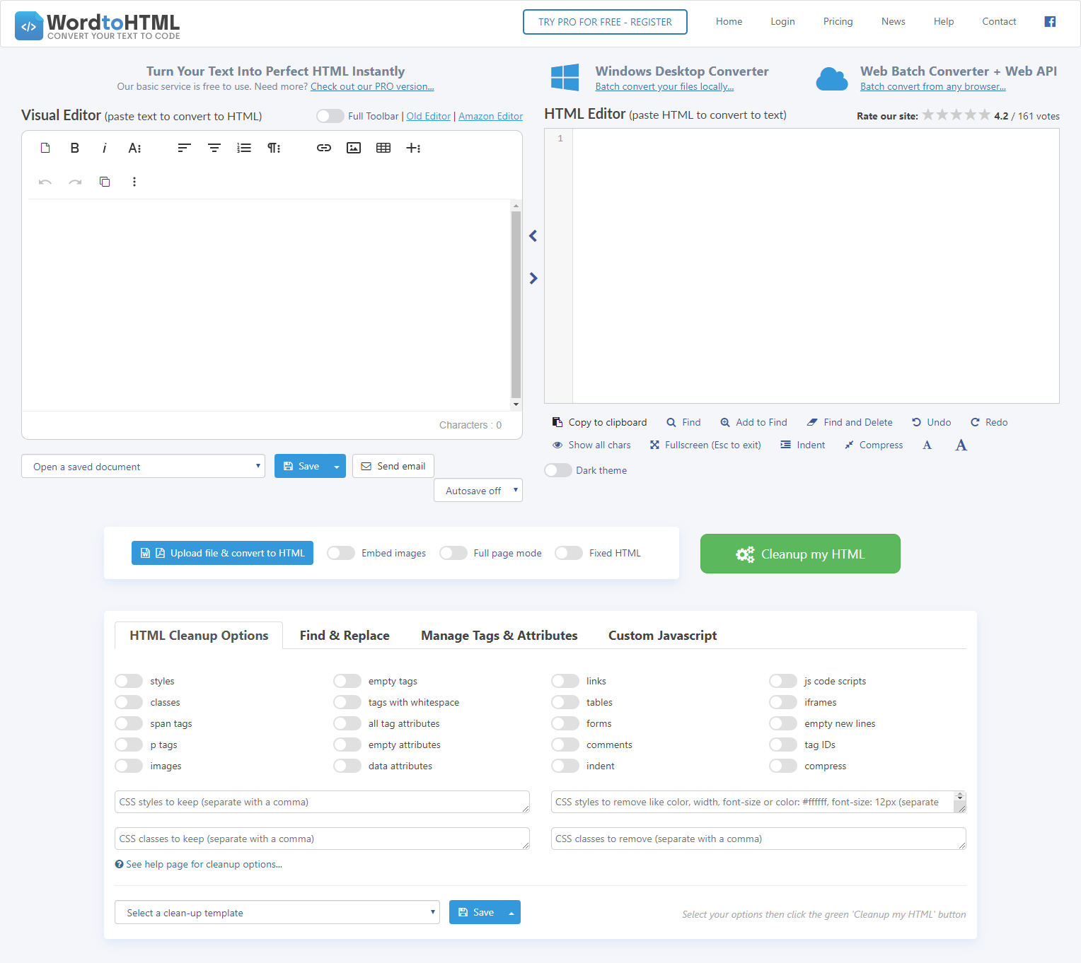 Instantly convert your text to HTML. Paste your text or upload and convert your Word, PDF and other documents to clean HTML. Easily remove code you don’t need with two clicks. Try it now… Supercharge your workflow by saving your cleanup options to a template. Export your HTML to Word or PDF. Create email signatures and with logos. Get extra options in the Visual Editor like more fonts and a spellchecker. Resize the windows to suit your needs. Save and open your files from any browser.